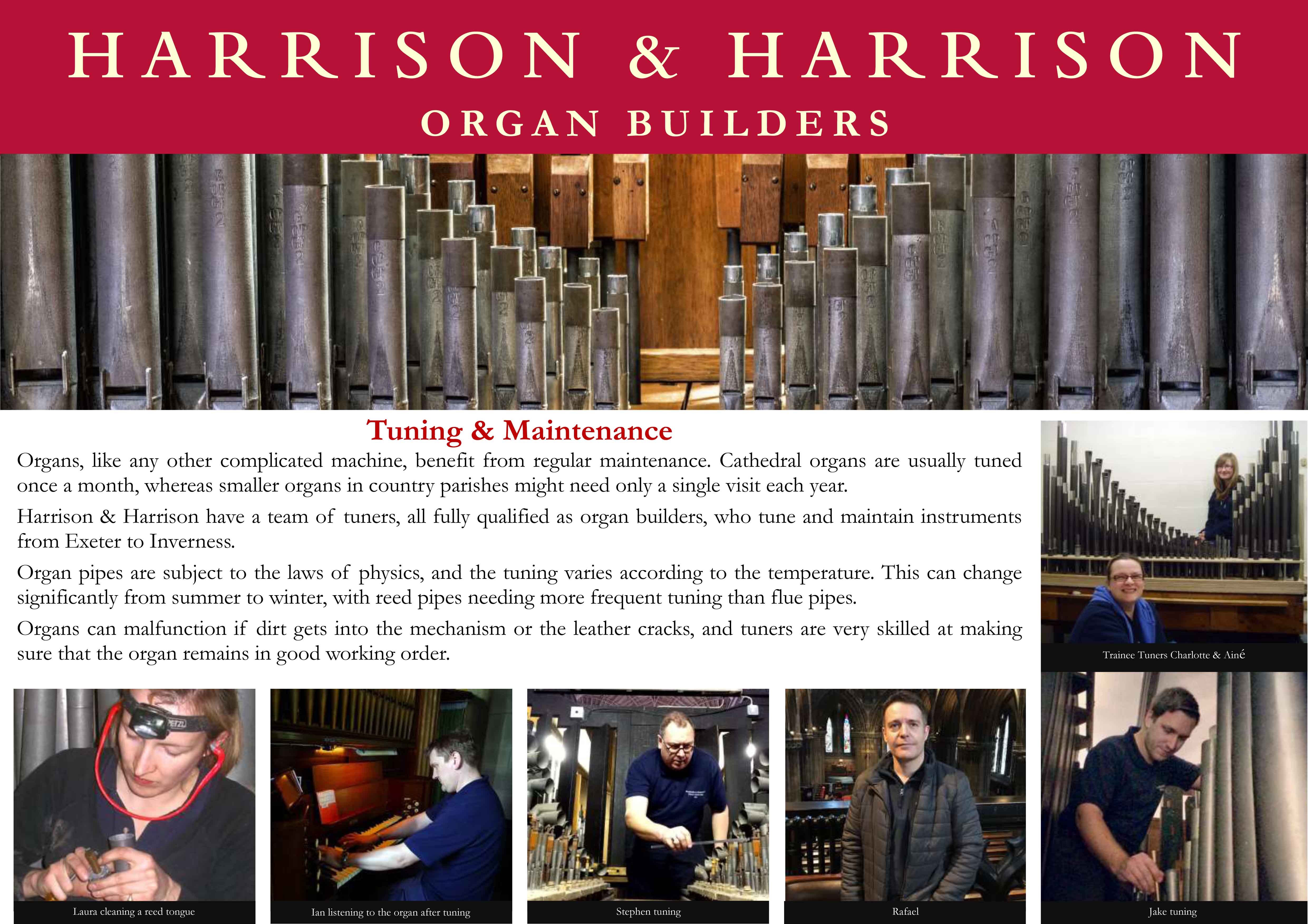 The work entails removing each reed pipe to reset slipped tongues, tighten wedges and replace dropped loads.