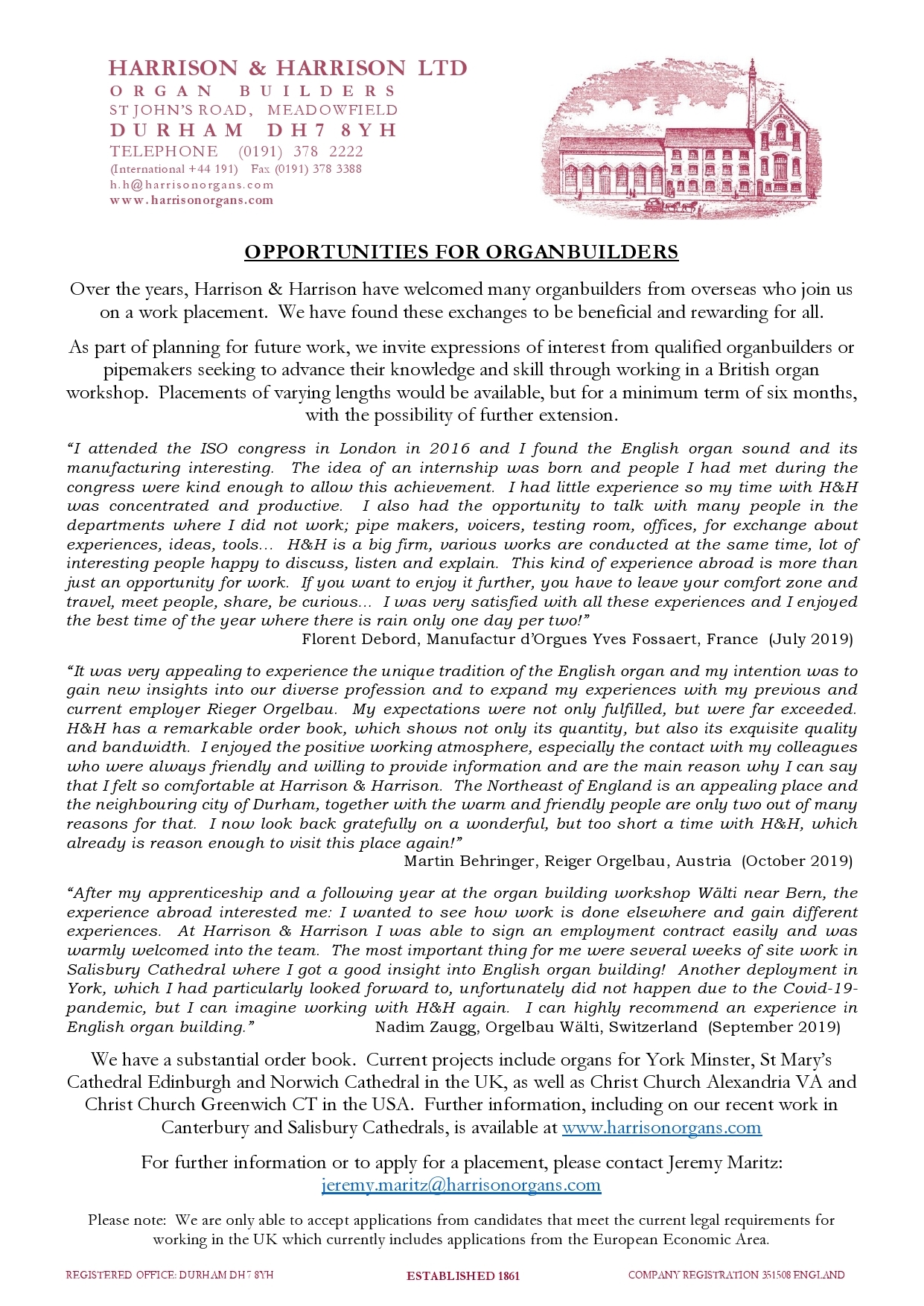 I am delighted to announce that H&H’s Board of Directors has approved the appointment of Andrew Scott to assist me as Deputy Managing Director. Alongside his new role, Andrew will also continue in his responsibilities as Head Voicer. This appointment affirms his important contribution to the firm and his commitment to our musical and organ-building values.