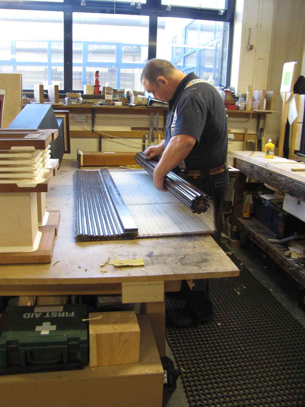 16ft Pedal Trombone, tongues being fitted |  16ft Pedal Trombone, tongues being fitted |  shallots being leathered ‘Hill’ style | |